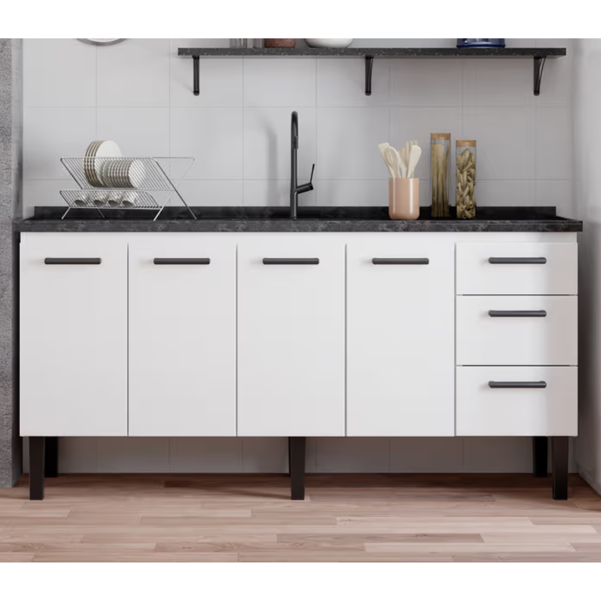 O gabinete conta com prateleira interna, três gavetas, gaveta com divisor de talheres e puxador arredondado com design moderno, garantindo funcionalidade e elegância em um só produto.